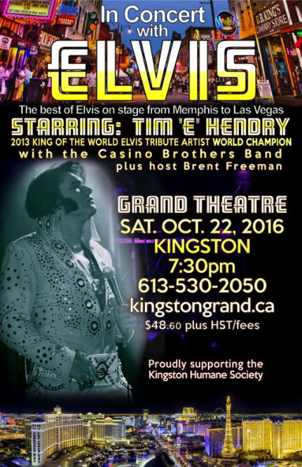 In Concert with Elvis is a show you don't want to miss! You will experience the best of Elvis on stage from Memphis through to the bright lights of Las Vegas. This exciting show will feature the King's most famous songs, looks and moves that he was so famous for. Starring Tim 'E' Hendry, 2013 King of the World Elvis Tribute Artist World Champion, Memphis TN, this will be a night to remember! Tim will be backed by the legendary Casino Brothers Band and joined by host Brent Freeman!