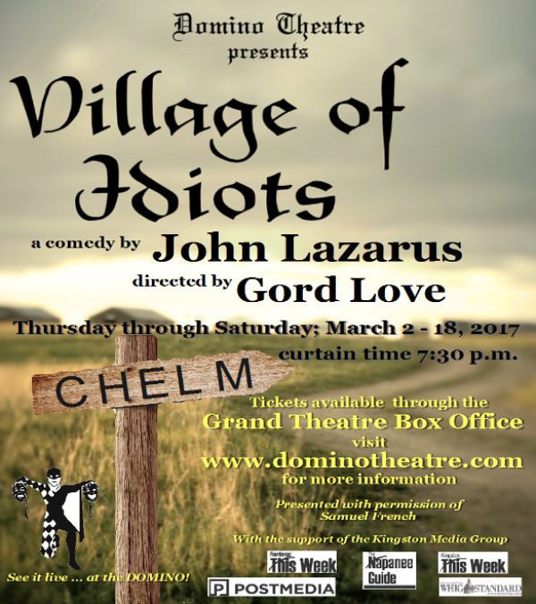 Playwright John Lazarus gathered many Chelm stories into one play, which has been entertaining people around the world for over 30 years. Now living in Kingston, he’ll be on hand to add his wisdom and devilish humour to our production at Domino. The problem that John himself added for Chelmniks to solve in their unique way is Cossacks. What do you do about people who just don’t find you funny and are quite ready to kill you? (Spoiler alert: the Chelmniks, in their bumbling but good hearted way, prevail.) John says, “This play is based on very old jokes and folk tales, but in these crazy times it seems, alas, truer than ever. As Miriam says, the Chelmniks may be idiots, but those other ones out there are crazy. However, if you, like Yosef, love a good story, then as Miriam says, you’ve come to the right village.” The cast of 21 is led by Angie Dorey and Damien Schaefer as two Outsiders succumbing to the charms of Chelm. The bumbling but always confident Chelmniks include Michael Chabon, Renee O’Farrell, Cassell Miles, Garrett McCrea, Poul Busk, Naomi Greer Ballance, Elizabeth Taylor and ten others. Gord Love directs, David Row designed the set, Dave Smith will handle lighting, Rachel Vandenberg the costumes, and Leslee Oliver will stage manage. It runs March 2-4th, 9-11, and 16-18 at 7:30 p.m. and it’s the Domino entry into the Eastern Ontario Drama League Festival.